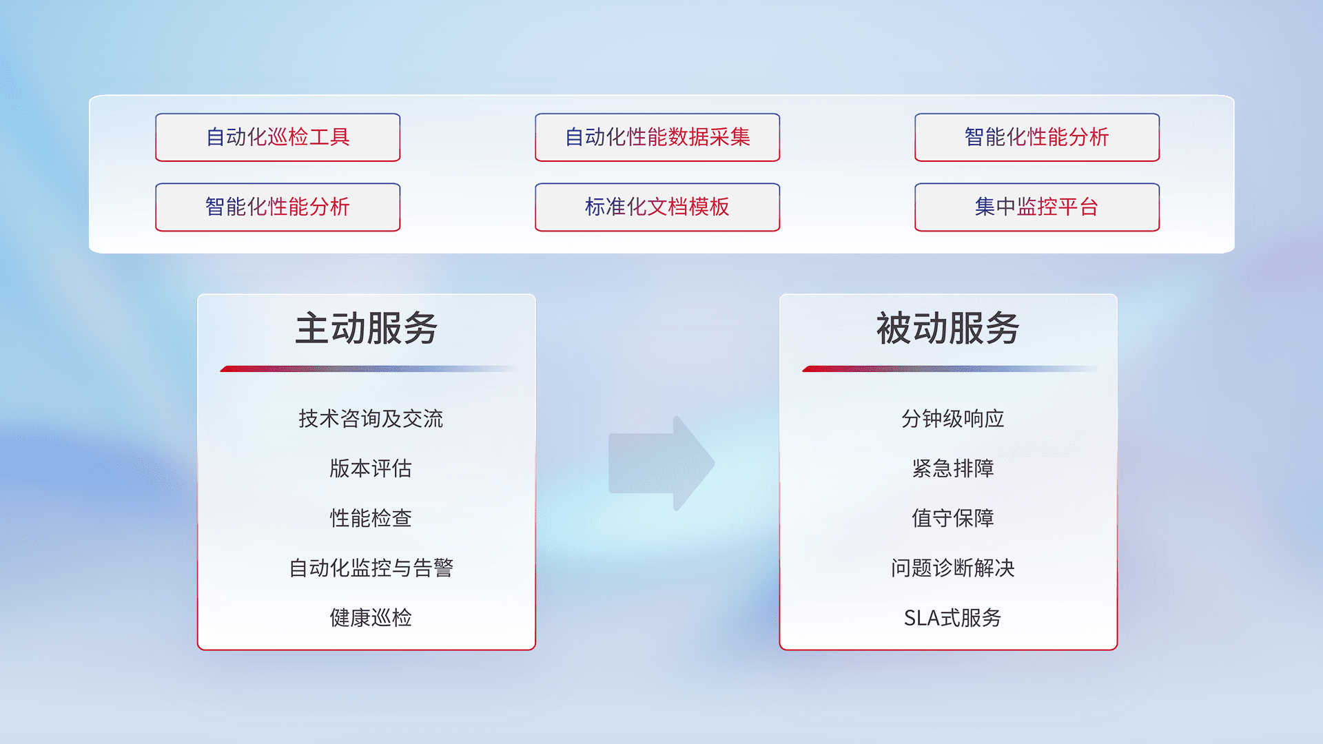 智能化工具和标准化文档,,,保障服务质量,,提供主动服务(包含技术咨询、、、、版本评估、、、性能检查、、、、自动化监控与告警、、健康巡检)和被动服务包含(分钟级响应、、紧急排障、、、值守保障、、、、问题诊断解决、、SLA服务)。。