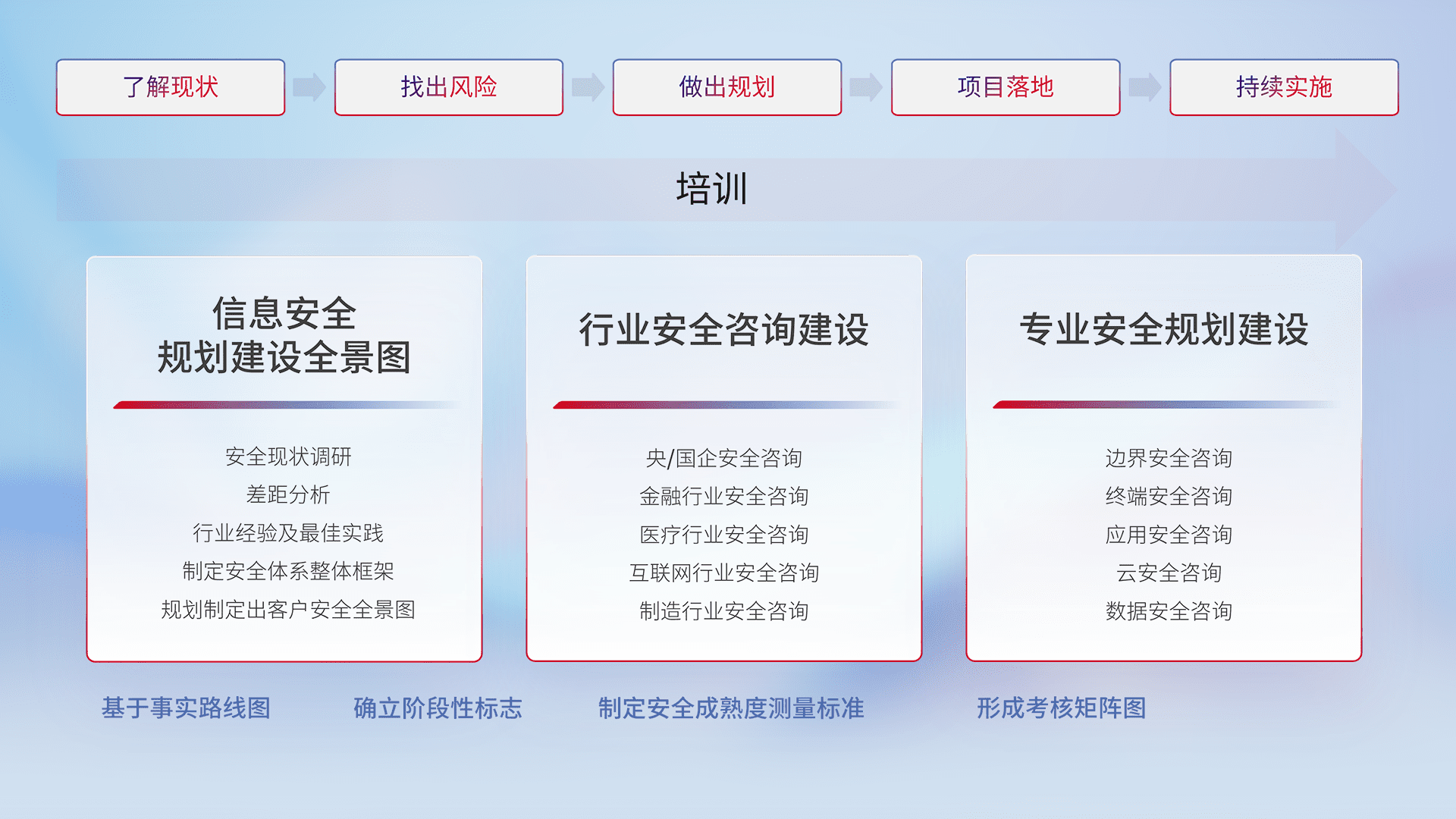 针对客户行业特性,,以专业的安全服务+多厂商联合解决方案提供专属的一站式安全管理服务,,,帮助客户全面感知网络空间威胁,,基于识别、、检测、、分析、、、、防护、、监测、、、响应的服务理论模型,,,从方案咨询、、集成交付、、评估验证、、、优化加固、、运维运营,,致力于为客户提供完整的闭环管理式安全服务。。以实战经验为客户打造高抵御风险的安全体系,,帮助客户发现威胁、、、对抗威胁、、处置威胁,,,不断积累安全对抗能力,,持续保障数字化安全。。。